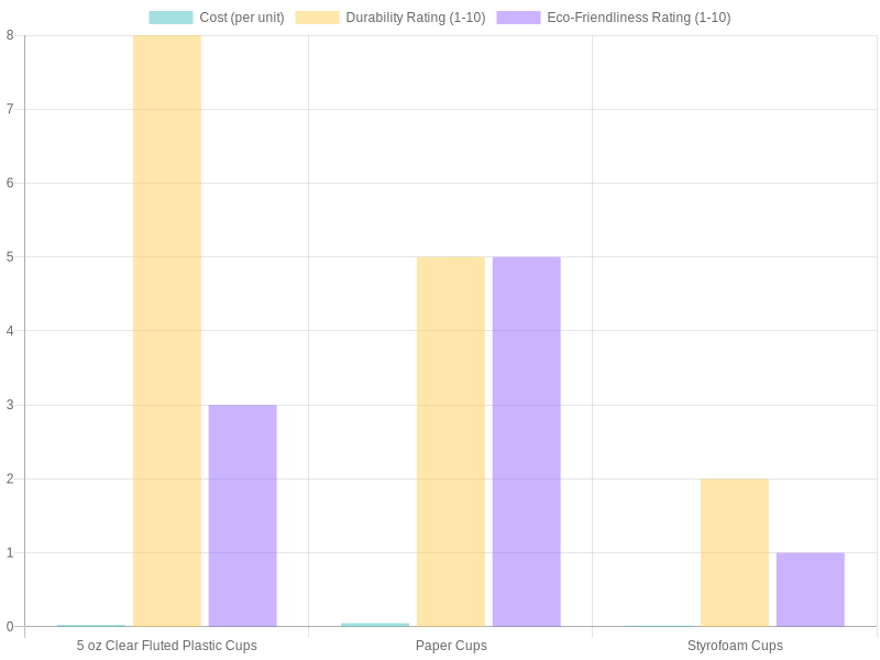 Here’s a comprehensive comparison table focusing on 5 oz clear fluted plastic cups along with paper and styrofoam cups. The table outlines important aspects like cost, durability, and eco-friendliness: