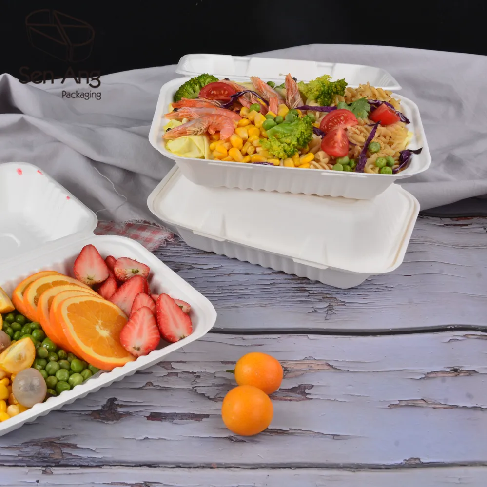 Senang is a professional sugarcane clamshell box manufacturer and supplier. Our sugarcane clamshell boxs are made of biodegradable and eco-friendly sugarcane pulp. The sugarcane clamshell box coating is made of PE, PP, PLA, Aqueous, has excellent leakage resistance. The sugarcane clamshell box is rcyclable, repulpable, biodegradable and compostable. After use, the environmental burden can be reduced through the correct recycling channels. Its material is tough and not easy to break, suitable for daily use by people in a fast-paced life.