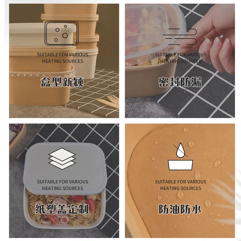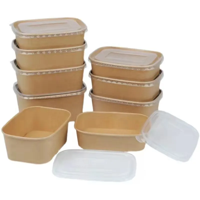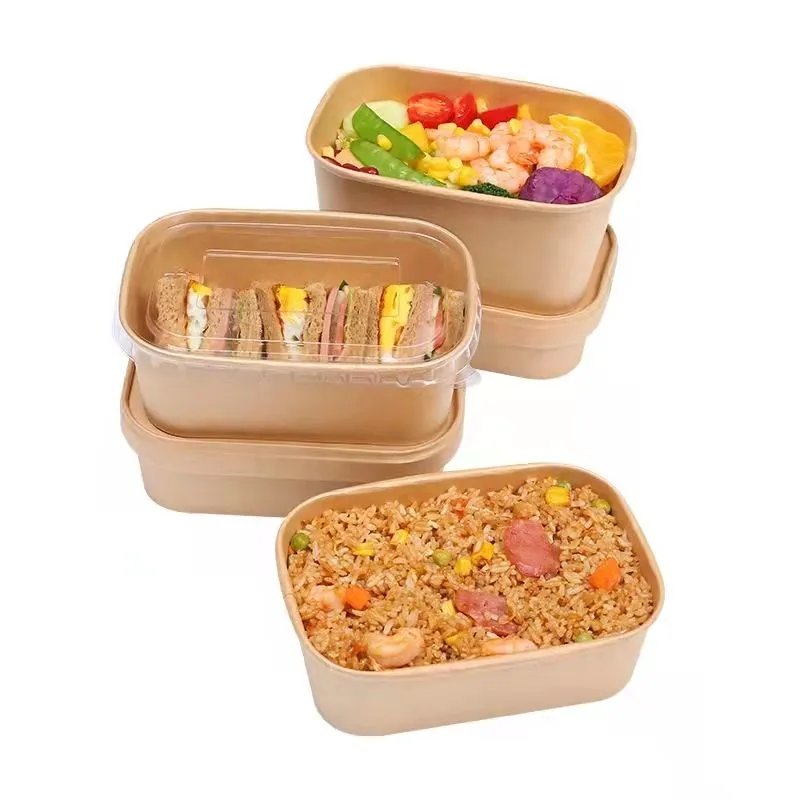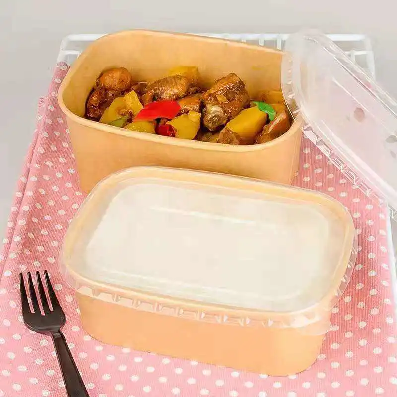 Disposable Kraft Paper PE Coating Take Away Rectangle Salad Bowl with Lid