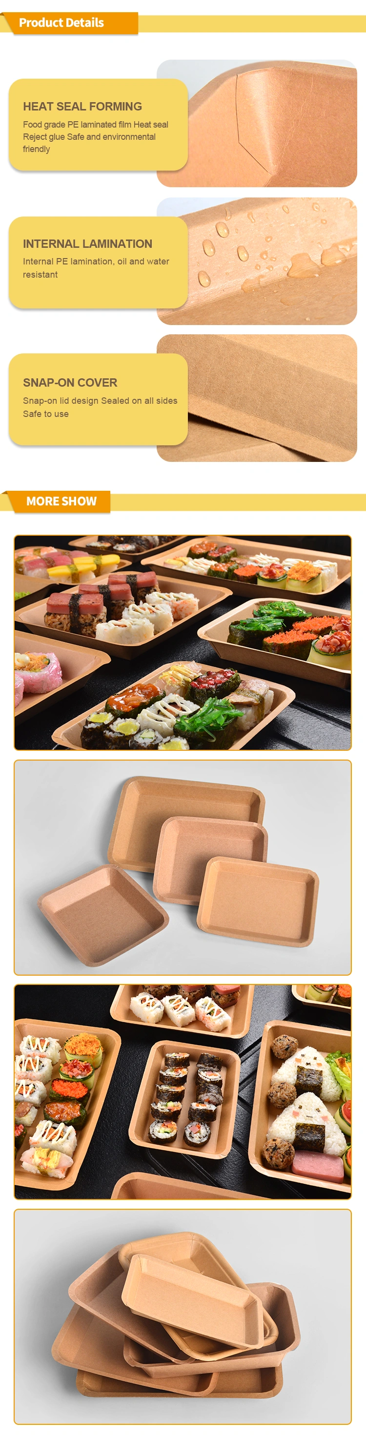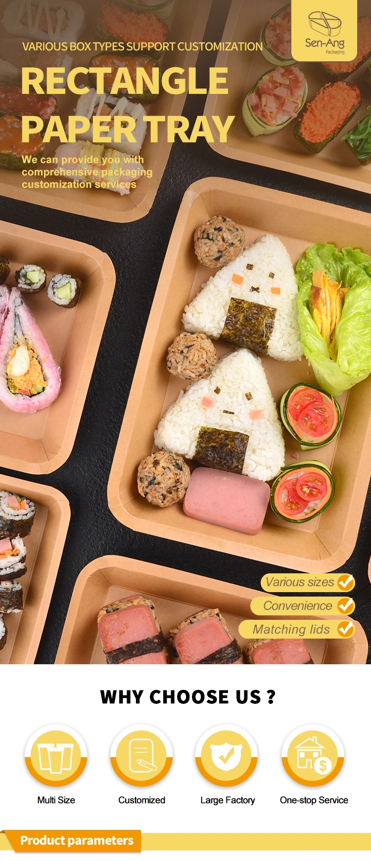 Whether it is family gatherings, dining in the cafeteria or takeaway, etc., our paper trays provide a convenient packaging solution. SenAng has paper trays of various materials and sizes to choose from. We also provide customized printing services, which is an excellent carrier for your brand promotion.