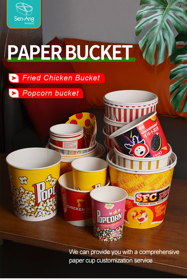 Whether it is family gatherings, dining in the cafeteria or takeaway, etc., our paper buckets provide a convenient packaging solution. SenAng has popcorn bucket of various materials and sizes to choose from. We also provide customized printing services, which is an excellent carrier for your brand promotion.
